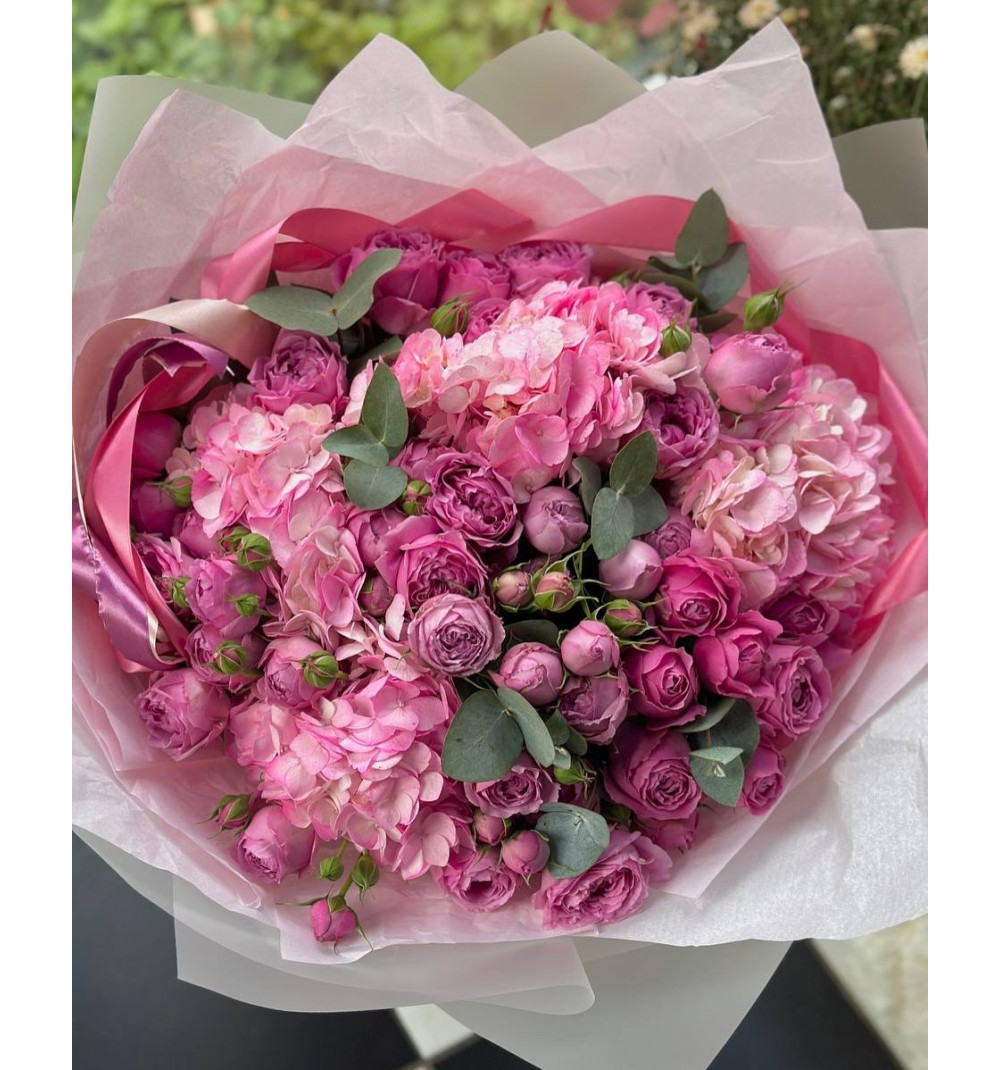 Нежно-розовый букет из пышных бело-розовых гортензий и изящных роз — это воплощение нежности и романтики.